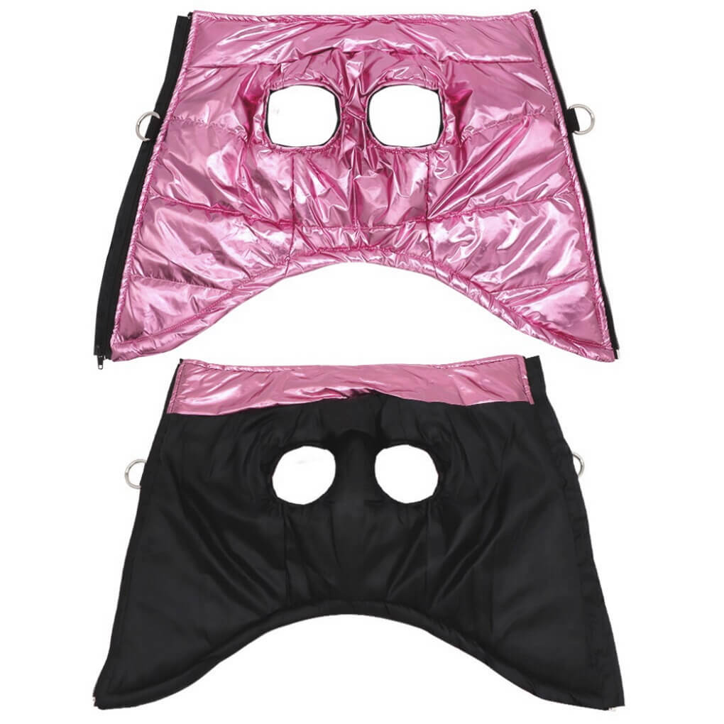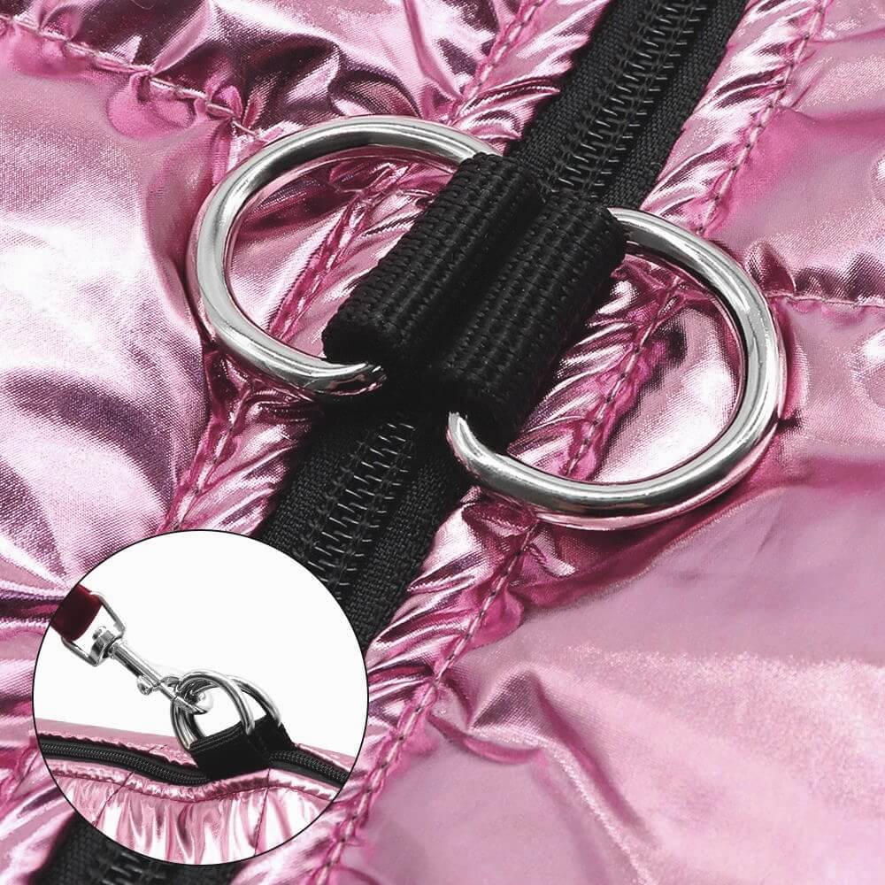 A shiny pink dog coat that is water-resistant and warm
