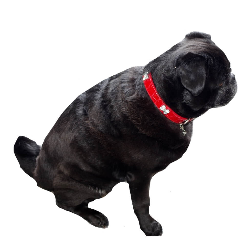 A red crocodile faux leather dog collar studded with three sparkling rhinestone bone charms