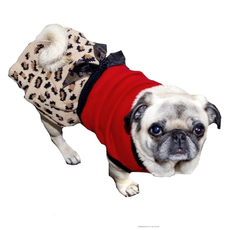 This sophisticated dog dress features a double-layered leopard skirt with a contrasting red with black trim top