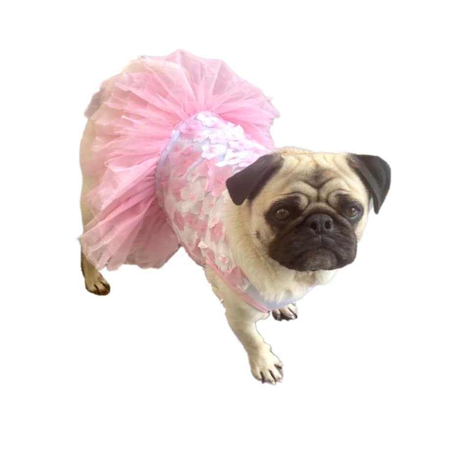 This puppy dress has a multi-layered tulle netting skirt that can be pulled apart to create fullness