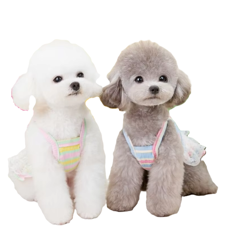A pretty doggie singlet dress in a cool stripes fabric with white lace over the skirt