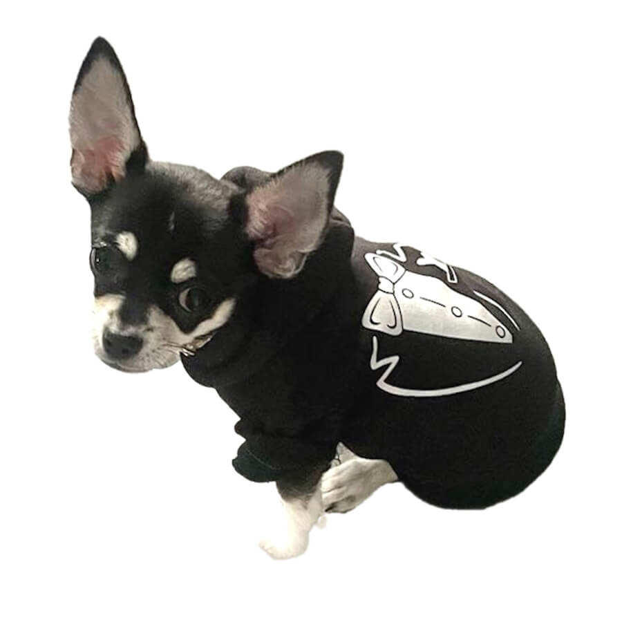 Featuring a white screen-printed tuxedo complete with bow tie and bone peeking out of the pocket