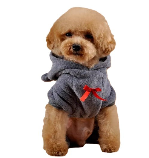 It has bear face on the hoodie with ears, a red bow on the neck and round tail