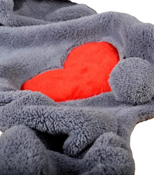 A fun fleece grey jumpsuit with teddy bear design and big red love heart on the back