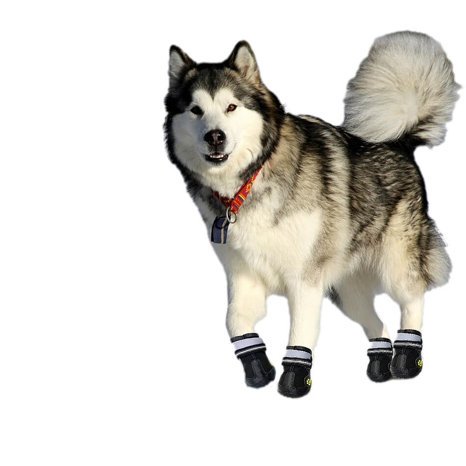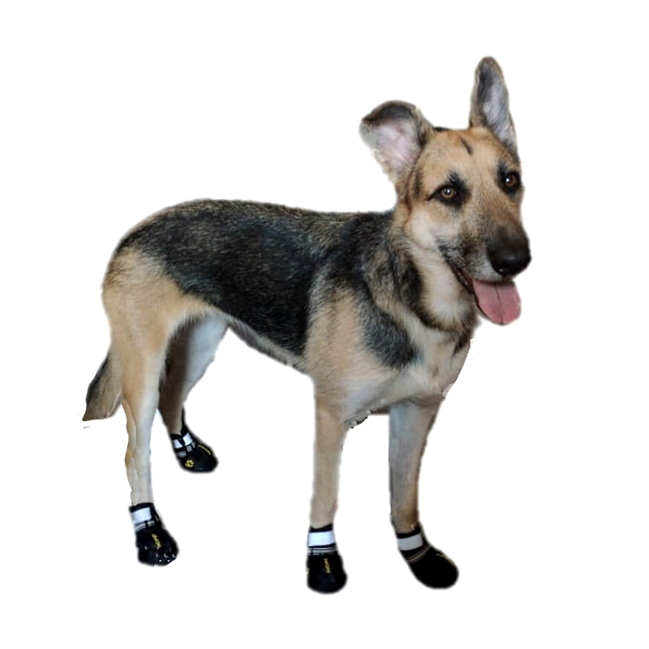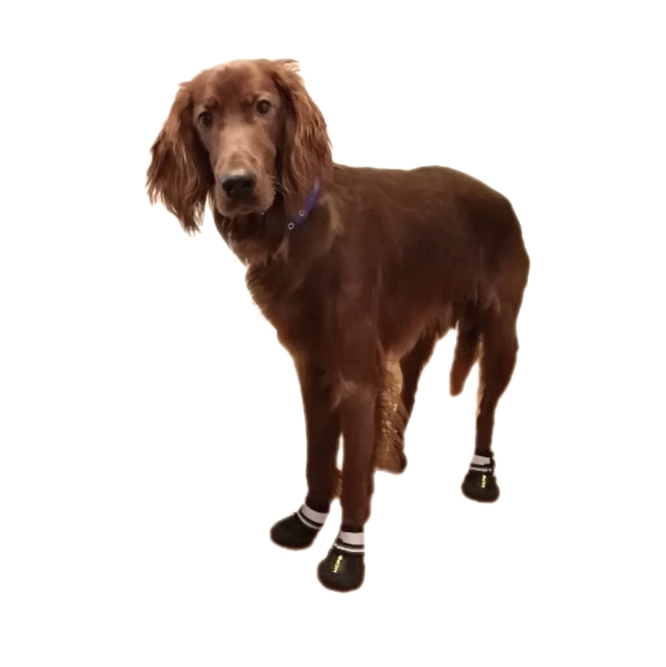 Water-resistant dog boots with rugged 'X' lugged base designed to grip on all terrains