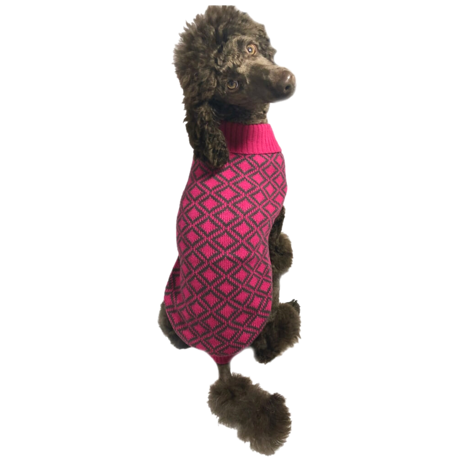 This thick, warm dog sweater has a wide neck for larger neck breeds or dogs who do not like restrictive necks