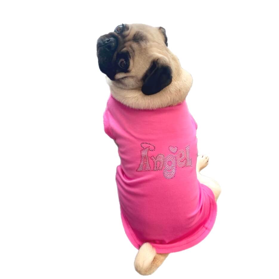 This dog shirt features the text ANGEL in sparkling multi-coloured rhinestones across the back
