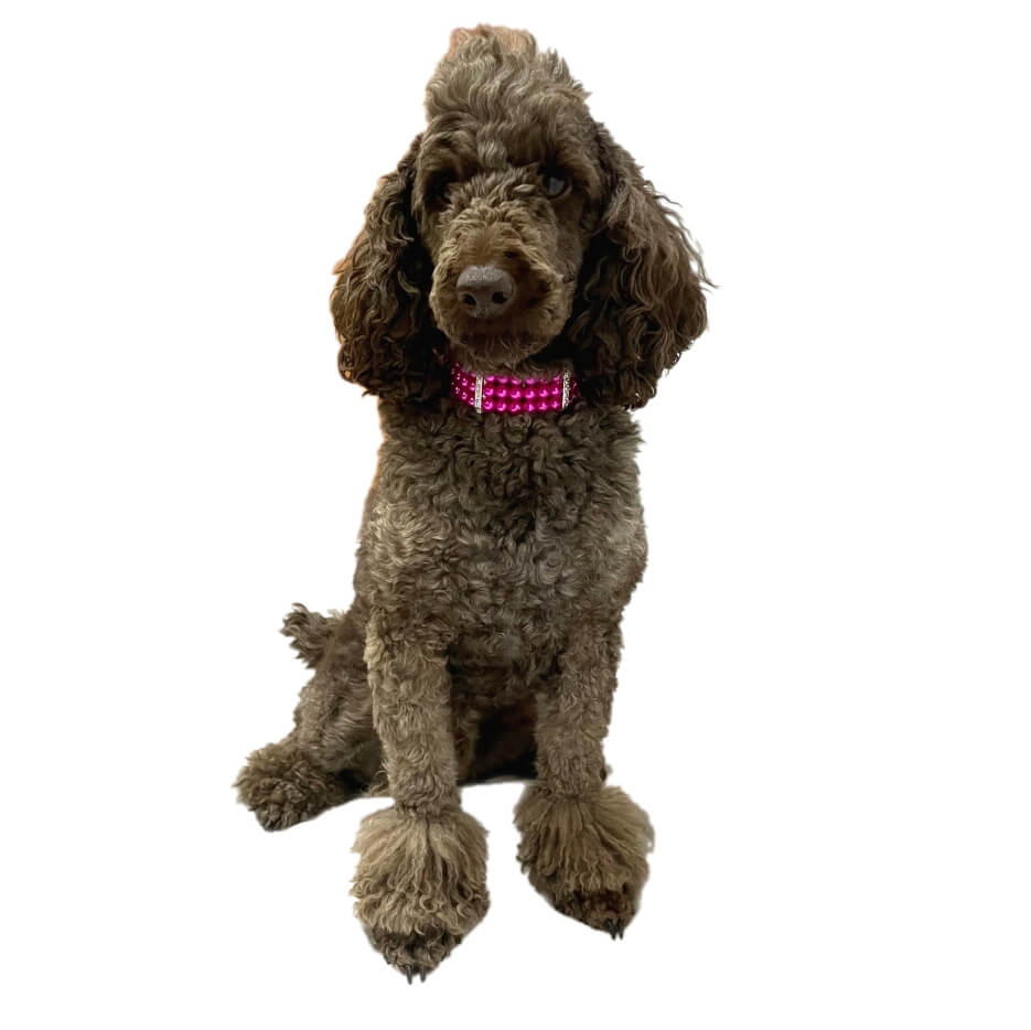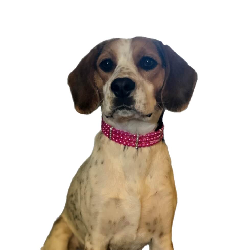 This doggy pearl collar has 3 rows of hot pink faux pearls accented with rhinestone-encrusted bars